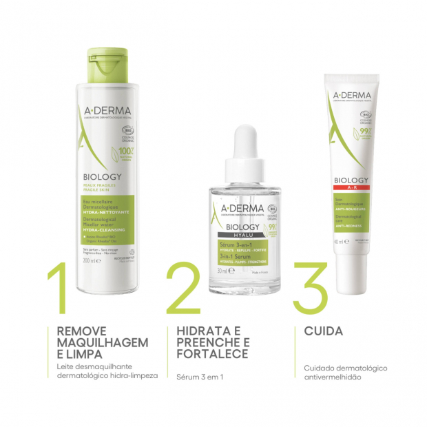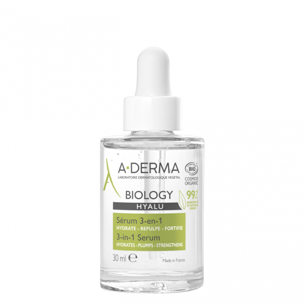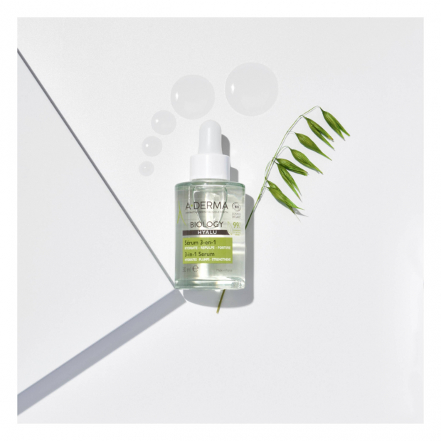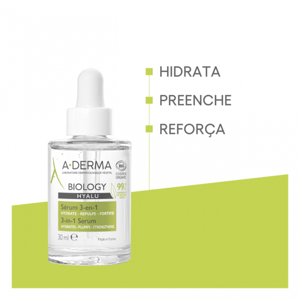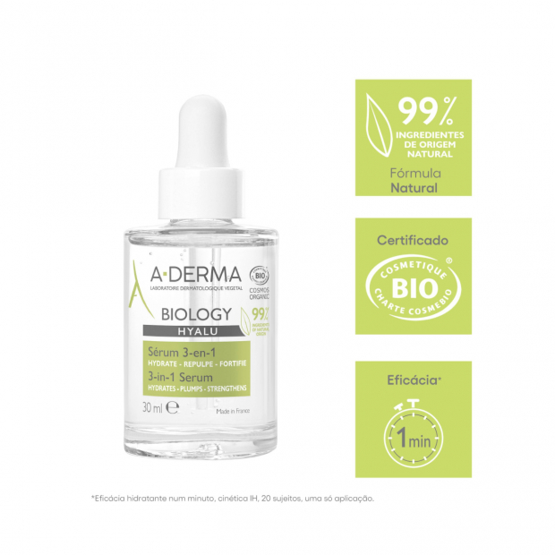 A-Derma Biology Hyalu Sérum 3-em-1 tem uma textura leve e não ontuosa, com 99% de ingredientes de origem natural, rica em: