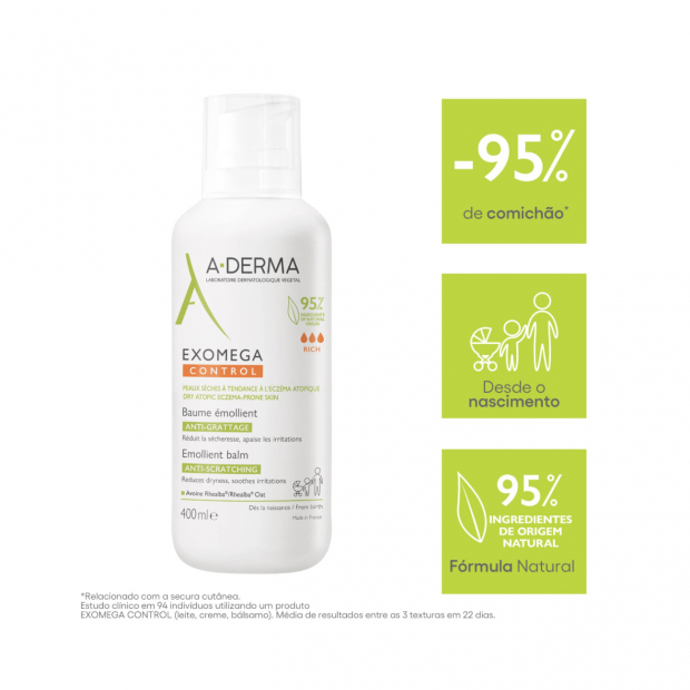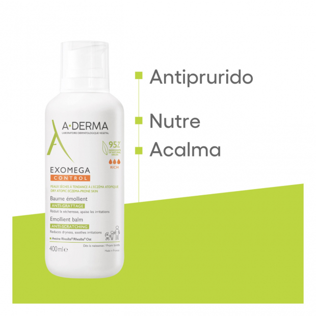 A-Derma Exomega Control Bálsamo tem uma textura rica e untuosa, com uma combinação de ingredientes ativos naturais (95%):