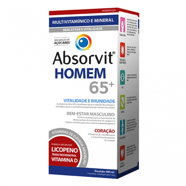 Absorvit Homem 65+ Emulsão é um completo nutricional para homens a partir dos 65 anos que contém: