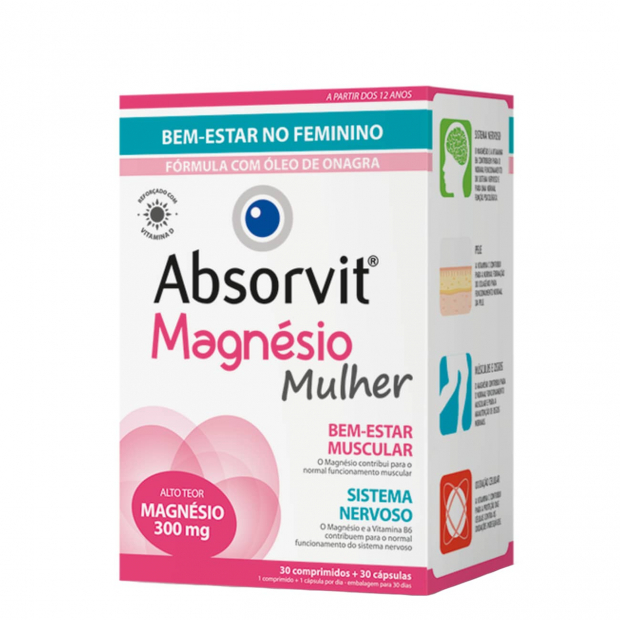 Absorvit Magnésio Mulher contém um complexo de óleo de onagra, magnésio e vitaminas. Separado em cápsulas e em comprimidos, este suplemento garante uma dose diária recomendada de cada um dos seus ingredientes. Alto teor de magnésio (300mg).