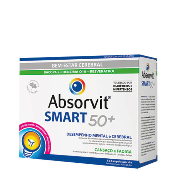 Absorvit Smart 50+ Ampolas é um suplemento alimentar especialmente desenvolvido para o bem-estar cerebral de adultos a partir dos 50 anos de idade. Contribui para um melhor desempenho mental, para um normal funcionamento do sistema nervoso e para reduzir a perda de memória e esquecimento. Ideal para períodos de elevado esforço intelectual e físico, envelhecimento cerebral, perda de memória, esquecimento e dificuldade de concentração.