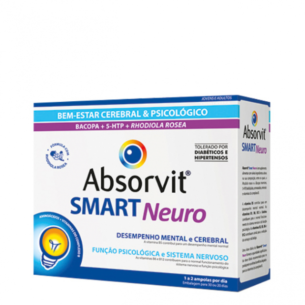 Absorvit Smart Neuro Ampolas é um suplemento alimentar que ajuda no desempenho mental e no equilíbrio do sistema nervoso.
