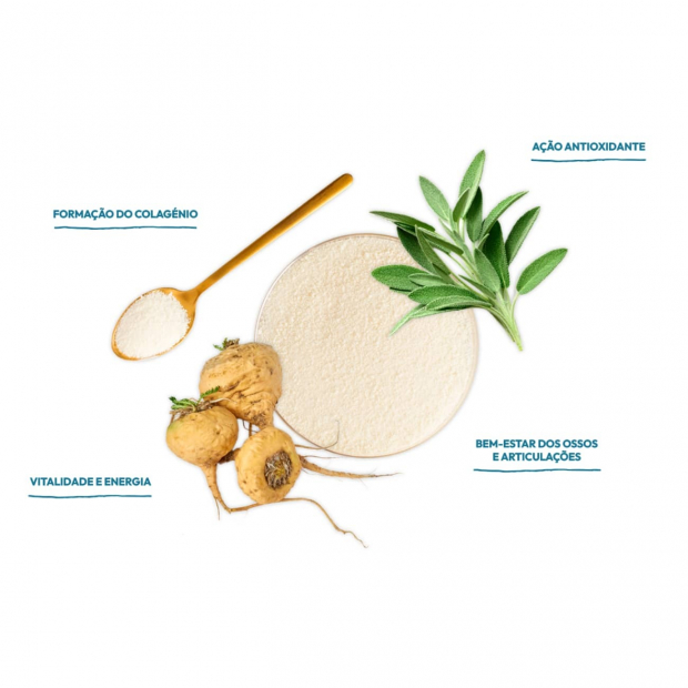 - Colagénio para melhorar a qualidade da pele e reforçar a estrutura dos tendões, ossos e cartilagens