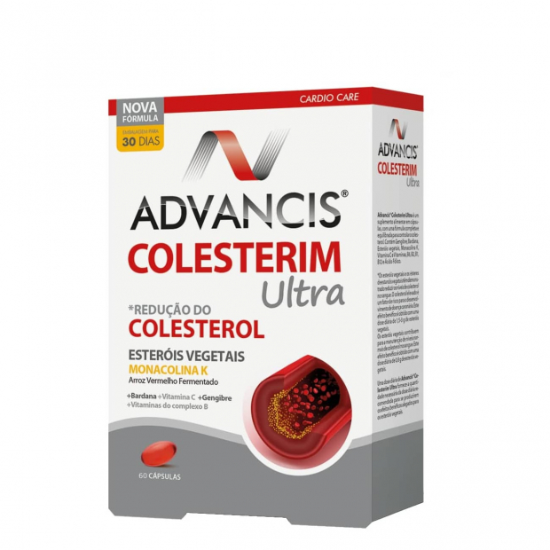 Advancis Colesterim Ultra contém monacolina K do arroz vermelho fermentado, cientificamente testado e provado que contribui para ajudar a manter os níveis de colesterol no sangue. Com vitaminas B6, B12 e ácido fólico que controlar a homocisteína, cuja concentração pode aumentar devido a fatores hormonais, nutricionais ou medicamentoses e que predispõem a um maior risco de problemas cardiovasculares. Associa Gengibre e Bardana.