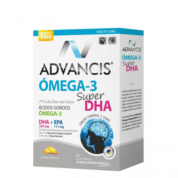 Advancis Ómega 3 Super DHA é um suplemento alimentar em mini-cápsulas, rico em: