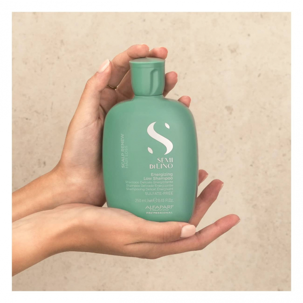 Alfaparf Semi Di Lino Scalp Renew Energizing Low Shampoo tem uma textura leve, uma fragrância fresca a hortelã e menta e uma combinação de ingredientes adequados às peles e cabelos mais sensíveis.