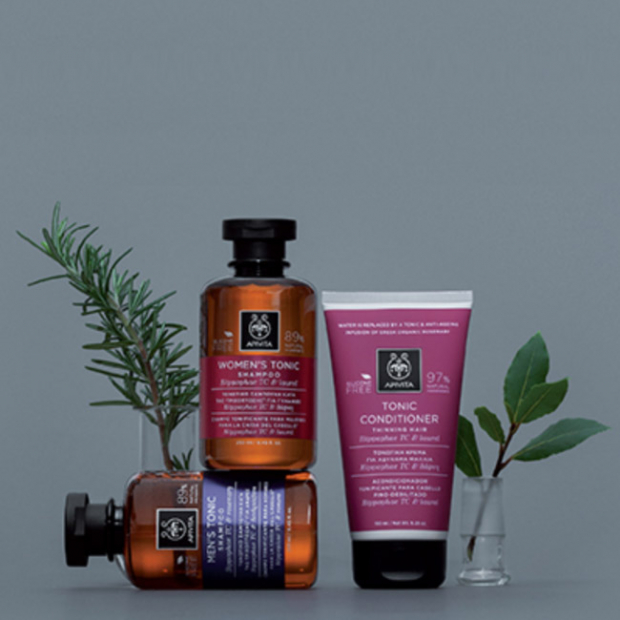 Apivita Condicionador Tonificante tem uma textura cremosa rica, formulado com ingredientes naturais (97%): hippophae TC, proteínas de tremoço e trigo, laurel, mel de tomilho, azeite, apishield HS, óleos essenciais de lavanda, salva, neróli e laurel, propólis (antibacteriano) e infusão de rosmaninho para uma ação fortificante, tonificante, anti-queda, densificante, revitalizante, anti-quebra e suavizante. O cabelo fica mais forte, denso, brilhante e saudável.
