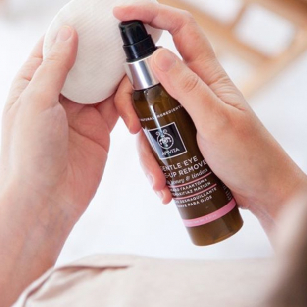 Aplicar Apivita Desmaquilhante de Olhos Suave na pele do contorno dos olhos, com a ajuda de um disco de algodão, em movimentos suaves e circulares. Repetir até o algodão sair limpo. Não necessita enxaguar.