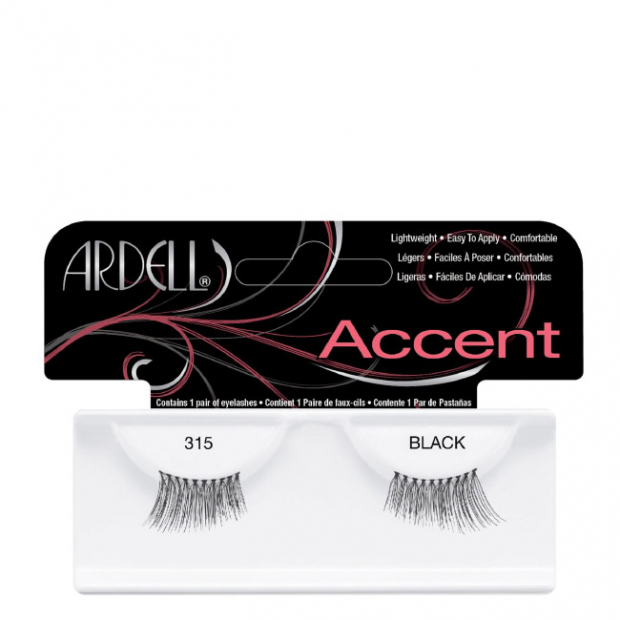 Ardell Accent 315 Black são feitas de cabelo natural, tamanho mais curto (metade de uma pestana normal), formato alargado e curvado e com uma banda (Invisiband®) fina para um efeito invisível e confortável.