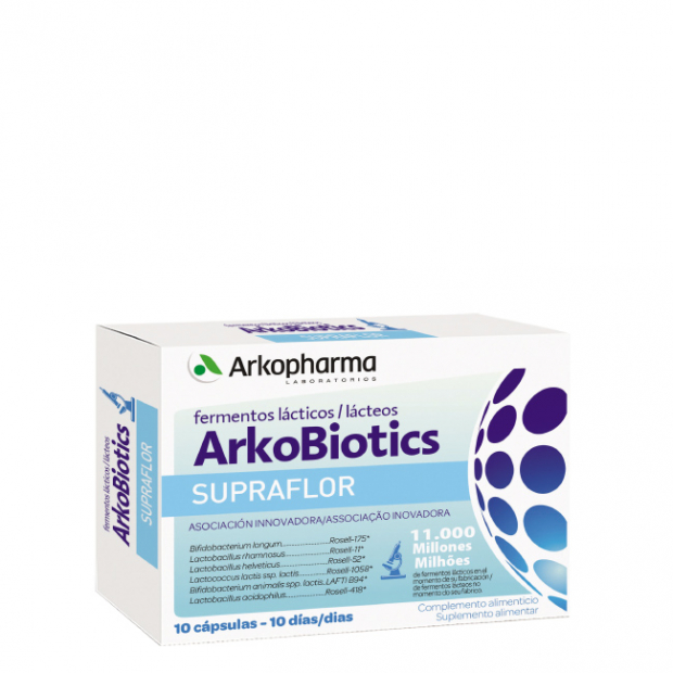 Arkobiotics Supraflor contém 11.000 milhões de fermentos lácteos ( Bifidobacterium longum Rosell-175, Lactobacillus rhamnosus Rosell-11, Lactobacillus helveticus Rosell-52, Lactococcus lactis ssp. lactis Rosell- 1058, Bifidobacterium animalis ssp. lactis LAFTIB94 e Lactobacillus acidophilus Rosell-418).