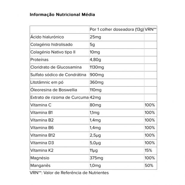 - Colagénio hidrolisado e colagénio nativo tipo II, associados ao ácido hialurónico para melhorar a cartilagem e articulações