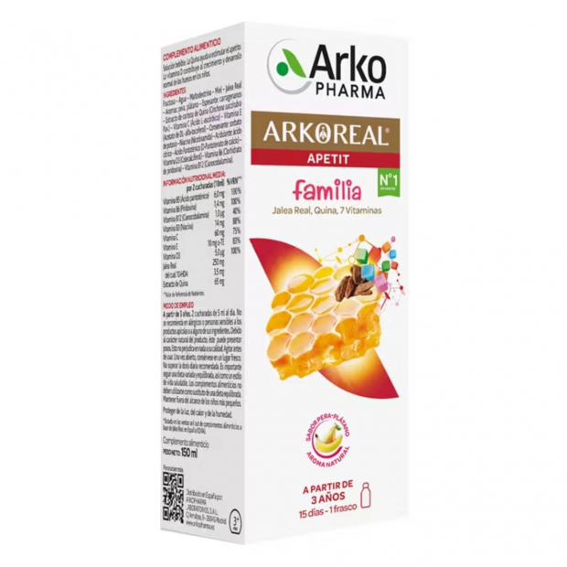 Arkoreal Apetit Família é um suplemento alimentar indicado a partir dos 6 anos para reforçar as defesas, aumentar a energia, atenuar a fadiga e estimular o apetite.