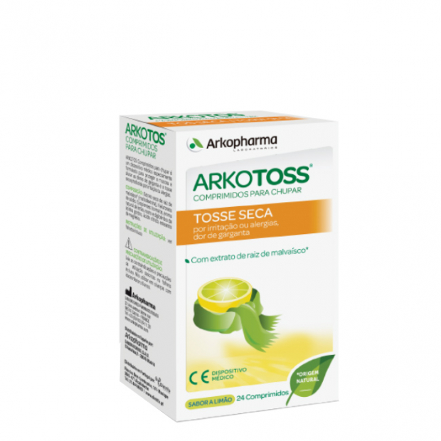 Arkotoss Tosse Seca são comprimidos para chupar que ajudam a proteger a mucosa e a aliviar a tosse seca, seja por irritação ou alergia. Atenua as dores de gargantas e o desconforto provocado pela tosse seca. Cria uma película protetora que adere à mucosa da garganta e que permite diminuir as irritações e inflamações. Sabor a limão.