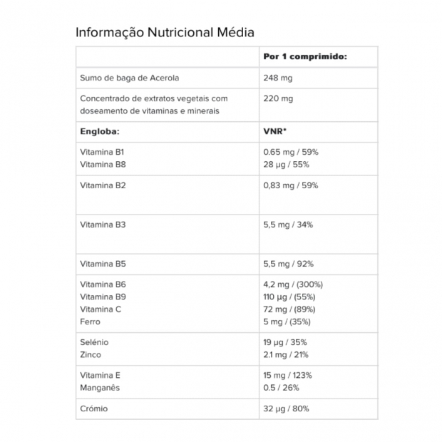 - Vitamina C, vitaminas do complexo B, sumo de baga de acelora, ferro, selénio, zinco, vitamina E, manganês e crómio.