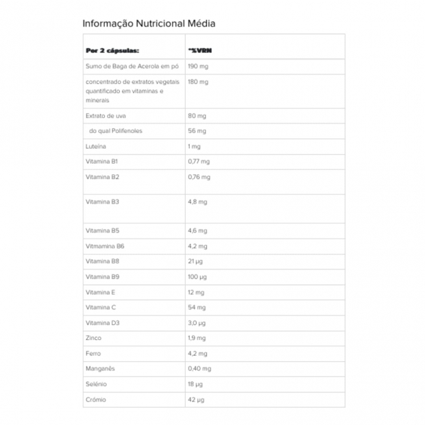 - Sumo de baga de acerola, extrato de uva, luteína, vitaminas do complexo B, vitamina C, ferro, selénio, zinco, vitamina D3, vitamina E, manganês e crómio, que em conjunto promovem o bem-estar geral nos adultos com mais de 50 anos.