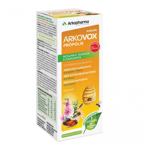 Arkovox Propólis e Equinácea contém extrato de folha de eucalipto, extrato de folha de malva, mel, extrato de própolis e aroma natural a menta.