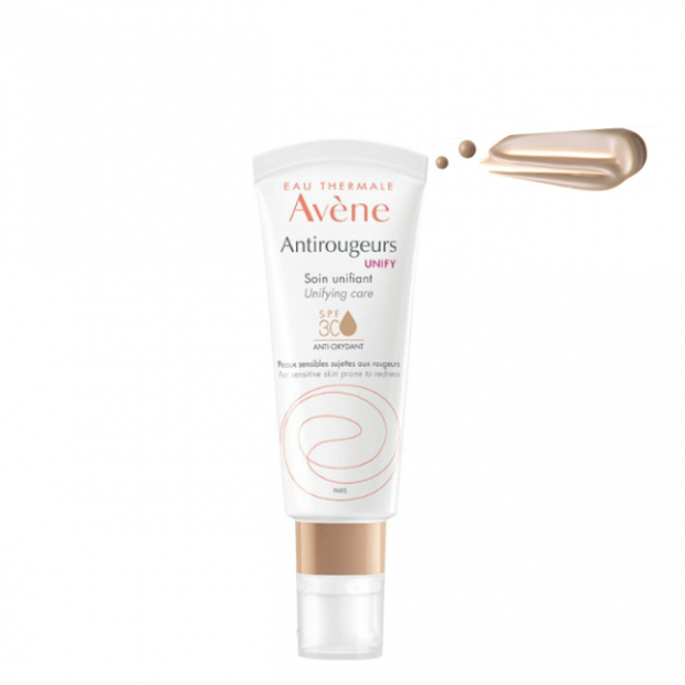 Avène Antirougeurs Unify SPF30 contém água termal d'Avène pela sua ação calmante, complexo TRP-Regulin que aumenta a tolerância da pele, sulfato de dextrano para diminuir a vermelhidão, óleo de pongamia que preserva o equilibrio da flora cutânea, nacarados e pigmentos refletores que disfarçam a vermelhidão e aumentam a luminosidade. Com proteção de SPF30 contra raios UVA e UVB e pre-tocopheryl, um antioxidante que ajuda a combater os raios solares, também responsáveis pelo aparecimento de vermelhidão.