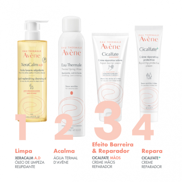 Aplicar Avène Cicalfate Creme de Mãos, pelo menos 2 vezes por dia, nas mãos previamente limpas. Insistir nas zonas mais afetadas.