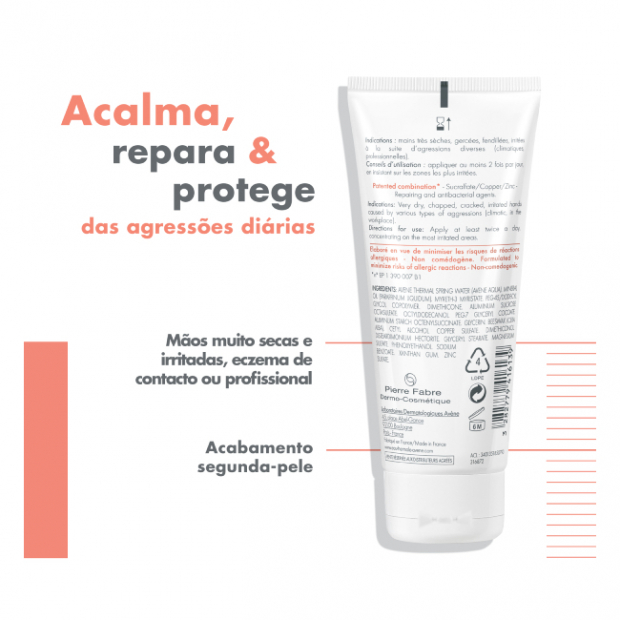 Avène Cicalfate Creme de Mãos tem uma textura cremosa leve, com Sucrafalto, constituinte que promove a reparação e o conforto da pele. A associação de sulfato de cobre com sulfato de zinco limita o risco de contaminação bacteriana. A Água Termal de Avène ajuda a suavizar e dessensibilizar a pele, proporcionando uma sensação de conforto imediato.