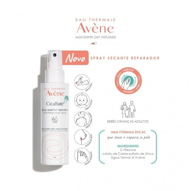 - Com pós absorventes, C+ Restore®, sulfato de cobre e zinco e água termal Avène para uma ação secante, reparadora, antibacteriana, calmante e suavizante