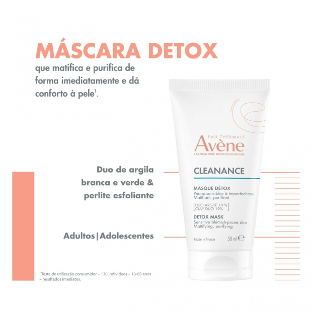 Avène Cleanance Máscara Detox tem uma textura de cor verde, que espalha facilmente e com aroma fresco e floral. Com 83% de ingredientes de origem natural, contém: