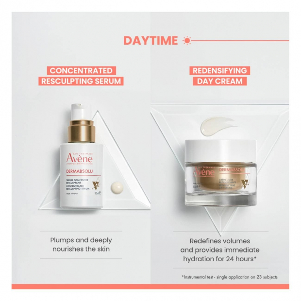 Aplica Avène DermAbsolu Creme de Dia de manhã, na pele do rosto, pescoço e decote, perfeitamente limpa e seca, com uma massagem suave. Evitar o contacto com os olhos. Para melhores resultados, combina este cuidado com o Sérum e o Creme de Noite.