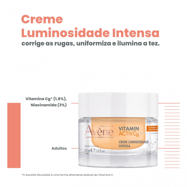 - 1.8% de vitamina Cg, com eficácia antioxidante equivalente a 20% de vitamina C, uma opção igualmente eficaz mas mais sustentável