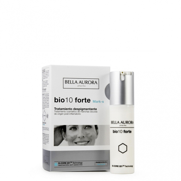 Bella Aurora Bio10 Forte Mark-s Tratamento Despigmentante tem uma fórmula que combina a tecnologia exclusiva B-CORE 221 com sistema de libertação inteligente, ácido kójico, vitamina C, esclareolide, exopolissacarídeo marinho e extrato de lírio do mar, para uma ação despigmentante, antioxidante, clareadora e antimanchas.