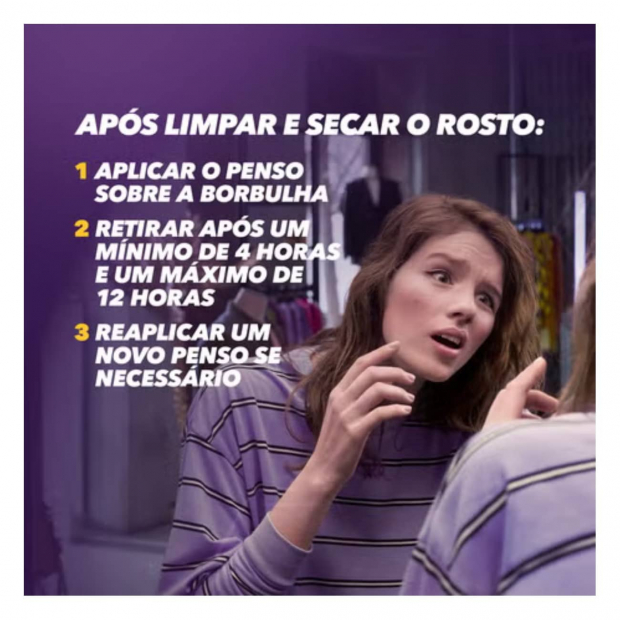Aplica 1 Benzacare Power Patch sobre a borbulha, deixa atuar durante 4 a 12 horas e aplica um novo penso, se necessário.