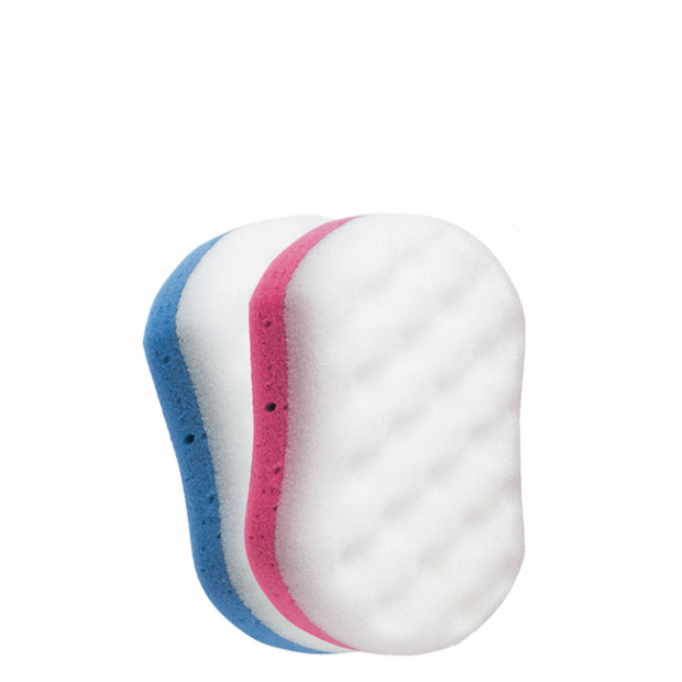 Esponja de banho, de dupla face, que limpa e esfolia suavemente a pele do corpo.