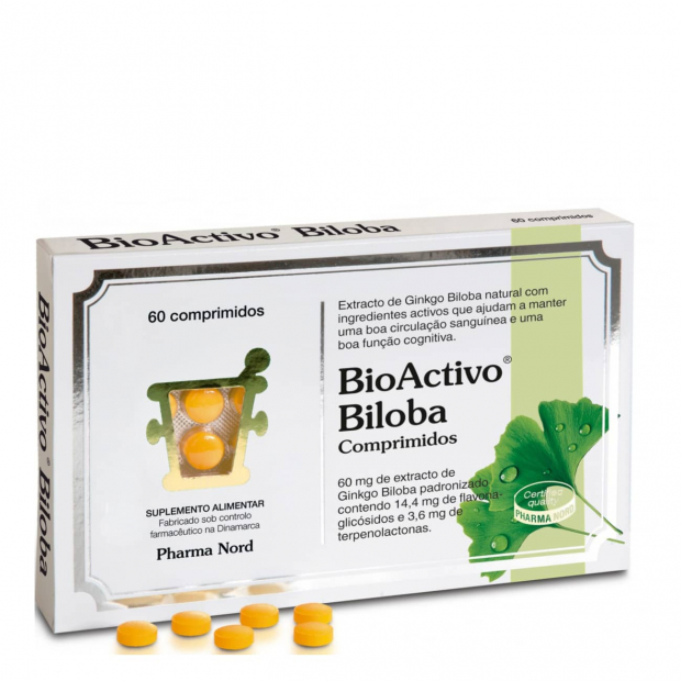 Bioactivo Biloba são 60 comprimidos de Biloba (Ginkgo biloba) para a memória e circulação sanguínea. A Biloba, árvore conhecida pelas suas propriedades curativas, contém substâncias ativas que protegem as células e ajudam a manter uma circulação saudável no cérebro e resto do corpo. Desta forma, este suplemento ajuda a resolver os problemas associados à má circulação dos pequenos vasos, como a falta de memória, tonturas e pés e mãos frios.