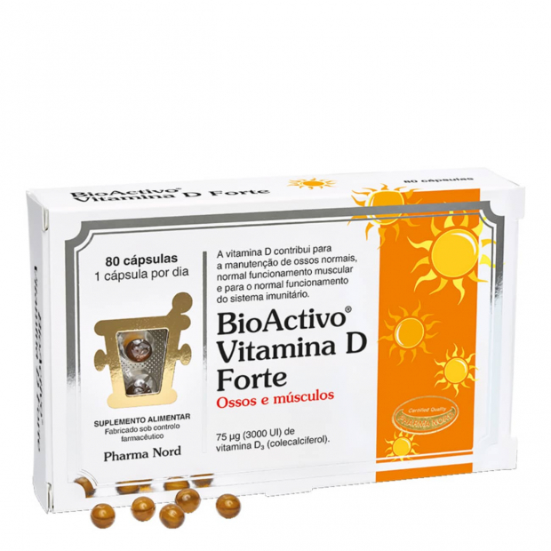 Bioactivo Vitamina D Forte é um suplemento em cápsulas, fácil de engolir e de elevada absorção, com 75 μg (3000 IU) de vitamina D3 dissolvida em azeite extraído a frio. A vitamina dissolvida em azeite extraído a frio aumenta a absorção no sistema digestivo.