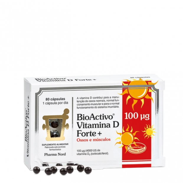 BioActivo Vitamina D Forte+ tem uma fórmula rica em vitamina D, em cápsulas moles de gelatina.