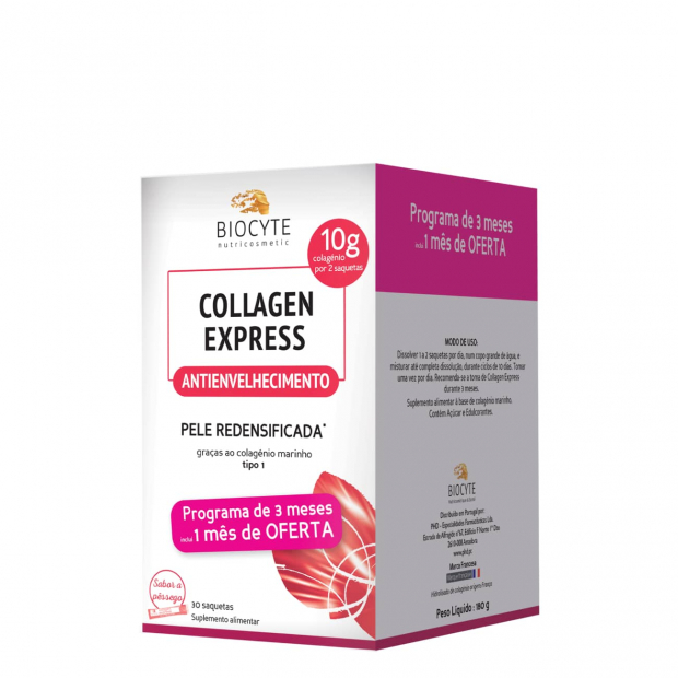 Biocyte Collagen Express é um suplemento em pó com sabor a pêssego que contém: