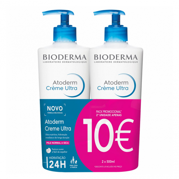 Creme hidratante e reestruturante para o cuidado da pele sensível, que seja seca e muito seca. Inclui 2 embalagens (2x500ml).