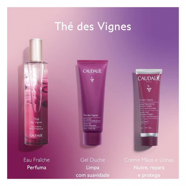 - Caudalie Gel de Duche Thé Des Vignes para um duche mais relaxante e envolvente, com o mesmo aroma que a água fresca. Respeita o pH da pele e é formulado sem sabão e sem parabenos.