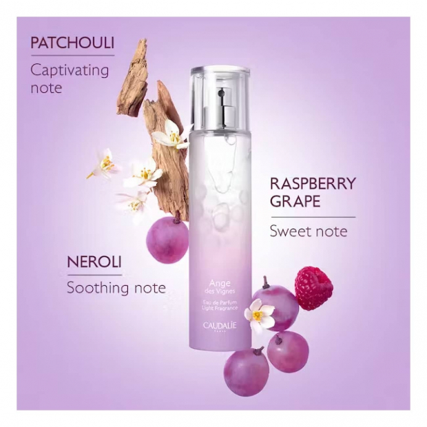 Caudalie Eau de Parfum Ange des Vignes tem uma fórmula com 89% de ingredientes de origem natural com os aromas: