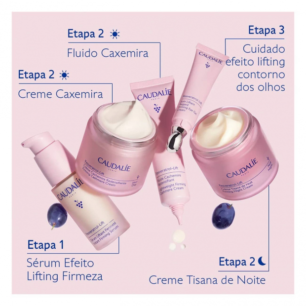 - Rico em resveratrol, um poderoso ingrediente antienvelhecimento patenteado pela Caudalie, proveniente dos sarmentos de videira, que corrige as rugas e refirma a pele