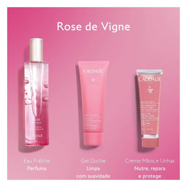 - Caudalie Gel de Duche Rose de Vigne para um duche mais relaxante e envolvente, com o mesmo aroma que a água fresca. Respeita o pH da pele e é formulado sem sabão e sem parabenos.