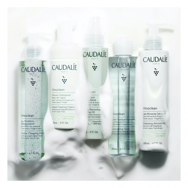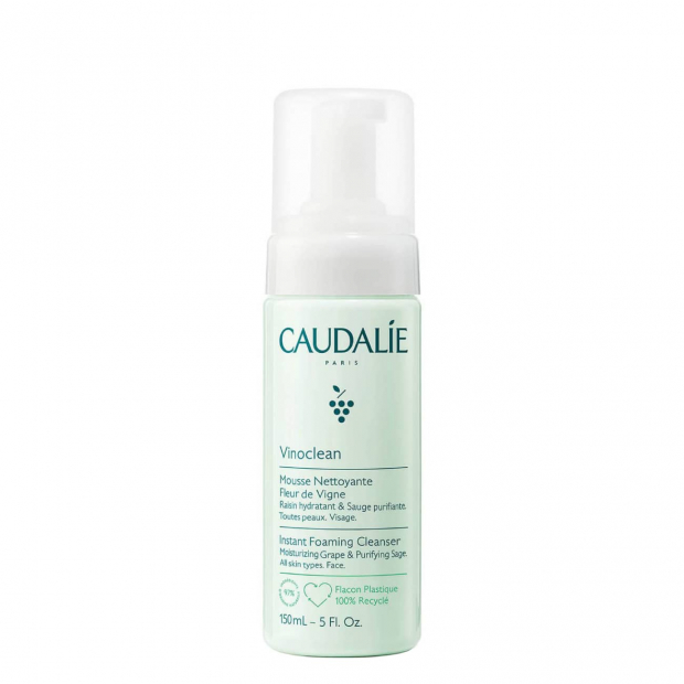Caudalie Vinoclean Espuma de Limpeza tem textura em loção cristalina que se transforma numa espuma untuosa, com 97% de origem natural: