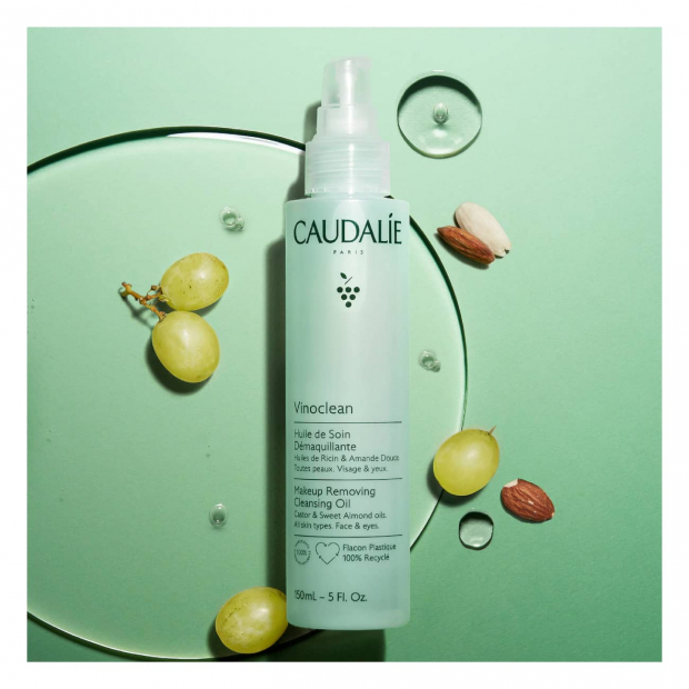 Caudalie Vinoclean Óleo Desmaquilhante tem uma textura em óleo fundente, com uma fórmula vegan 100% de origem natural: óleos vegetais de castor e amêndoas doces para uma ação de limpeza suave, hidratante, purificante e suavizante.