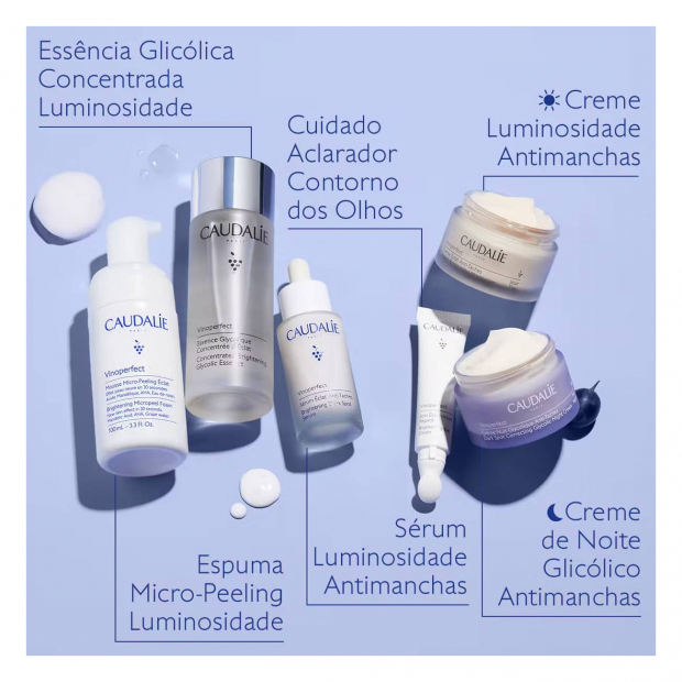 Aplica Caudalie Vinoperfect Sérum, de manhã e à noite, na pele do rosto, pescoço e decote, perfeitamente limpa e seca, antes do cuidado hidratante habitual.