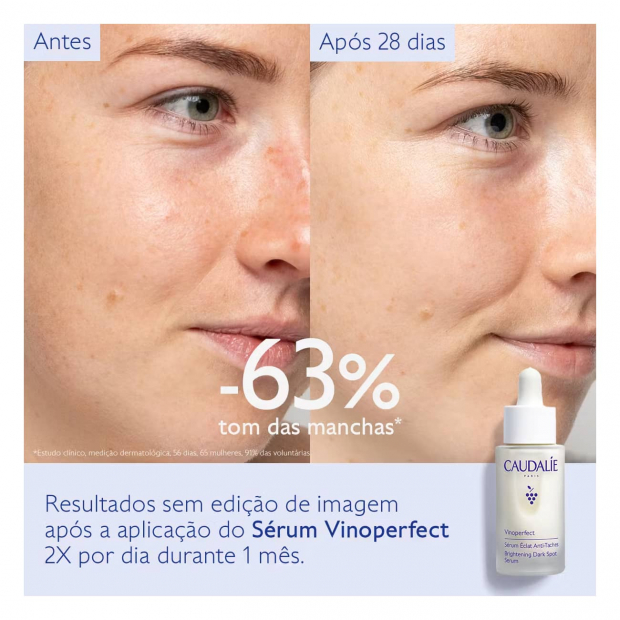 Os estudos clínicos mostram que após uma embalagem há uma redução de 63% das manchas.