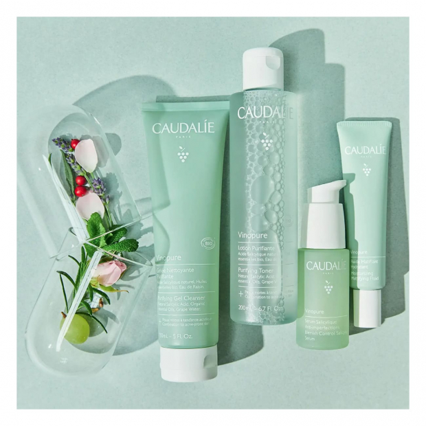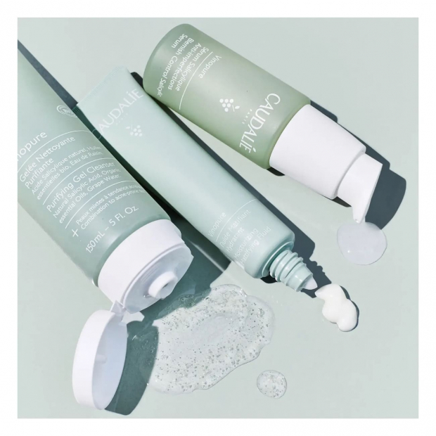 Caudalie Vinopure Fluido tem uma textura fluida e fresca, vegan, com uma combinação de 96% de ativos naturais: