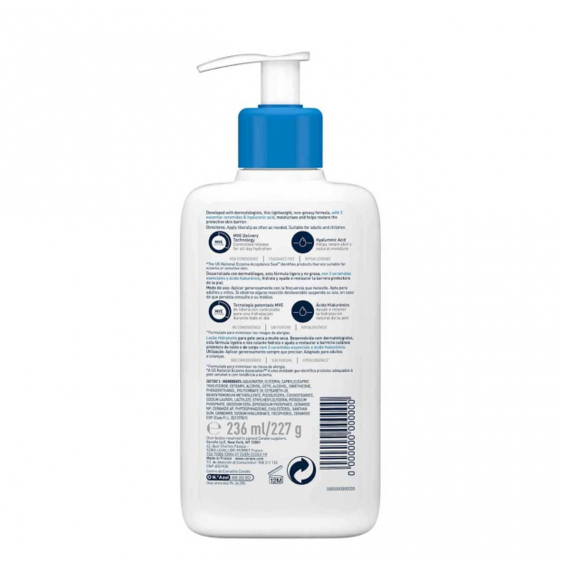 Cerave Loção Corporal Hidratante tem uma textura ligeira, de rápida absorção e não colante, numa fórmula desenvolvida com dermatologistas para total compatibilidade com a pele sensível.