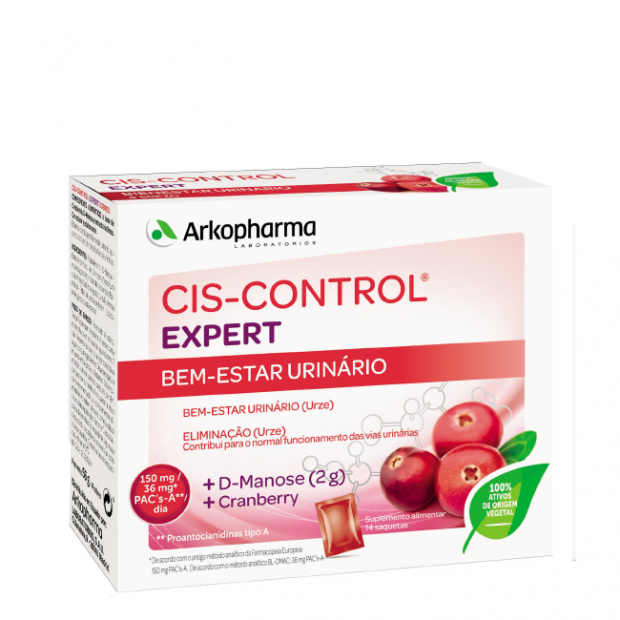 Cis-Control Expert contém D-Manose (2000mg), extrato do fruto de cranberry (263mg) e extrato das sumidades floridas de Urze (250mg).