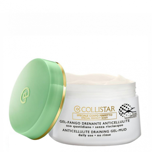 Collistar Anticellulite Draining Gel Mud tem uma textura cremosa suave, com uma combinação de ingredientes ativos: tecnologia exclusiva Slim-Drone®, extrato de coccoloba uvifera, lama branca e escina para uma ação anti-celulite, drenante, detox e estimulante.