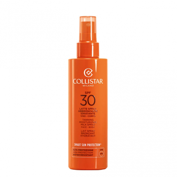 Para proteger a pele do rosto e corpo enquanto aceleras o bronzeado, experimenta o Collistar Tanning Moisturizing SPF30 Leite Spray.