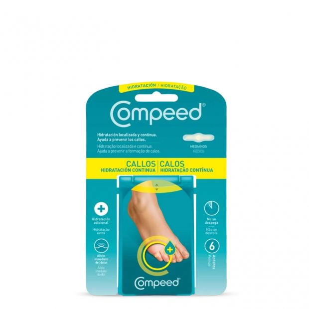 Compeed Penso Calos contém ácido salicílico, substância que promove a remoção da lesão, provocando uma sensação de alívio da dor, Compeed é um penso de base hidrocolóide, que ajuda a dar conforto e a amortecer a zona lesada. Os pensos Compeed contêm um gel especial que ajuda a aliviar a dor e a remover a calosidade. Compeed Hidratante, contém, também, como o próprio nome indica, um sérum que hidrata e suaviza o calo mais eficazmente. Para efeitos mais duradouros, evitar usar sapatos apertados ou que causem desconforto.