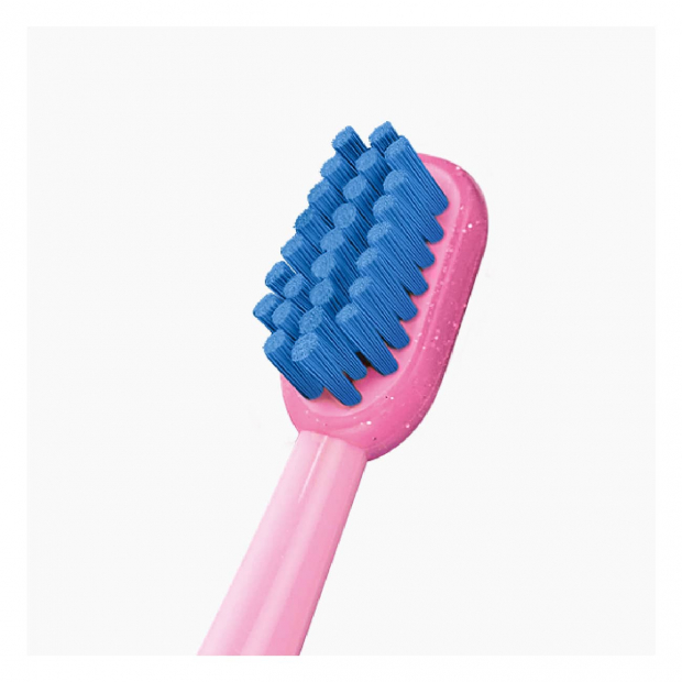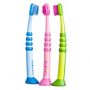 Esta escova de dentes ergonómica tem uma cabeça de escovagem de borracha para proteger a mucosa bucal dos mais pequenos e uma pega arredondada que ajuda a criança a segurar a sua escova de dentes da maneira correta.